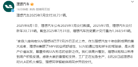 2025年8月1日,理想汽车公布2025年7月交付数据。2025年7月,理想汽车交付新车30731辆,2024年7月交付51000辆,同比下降39.74%。